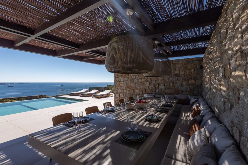 The exterior space of this luxurious property includes 2 impressive infinity pools that create the unique feeling of absolute extension of water flowing into the vast horizon and the sparkling sea. This sense of freedom combined with the breathtaking view of the Aegean Sea make swimming here a truly enjoyable and relaxing experience. The pools include floating loungers for a cool and pleasant stay under the hot and persistent summer sun. The area around the pools has additional loungers and umbrellas for shade, protection from the heat, and uninterrupted reading or mind-wandering any time of the day.