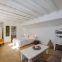 The wooden double bed with the white strips falling from the top, overlooks the crystal blue waters of Agrari Beach. From this room you have only to open your eyes to watch the sunrise from the bed.