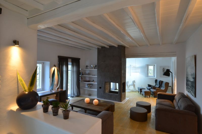 Villa "Artisti" loves grey. It matches perfectly with the rocky scenery of Agrari area where Artisti is located. You will understand it as soon as you get in. The main house consists of three different levels.