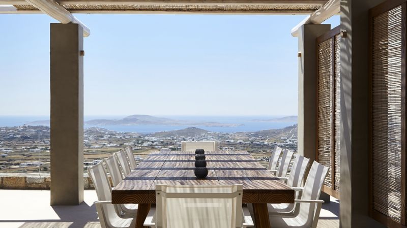 An amazing ground level, 240sqm villa, stunningly built at the hilltop of the complex overlooking the Aegean Sea and Cyclades islands. Can accommodate up to 6 guests, with 3 bedrooms, 2 master with en suite bathrooms and one separate bedroom. From the grand master suite, the guest has a panoramic view of Mykonos Island and during nighttime it feels like dancing lights.